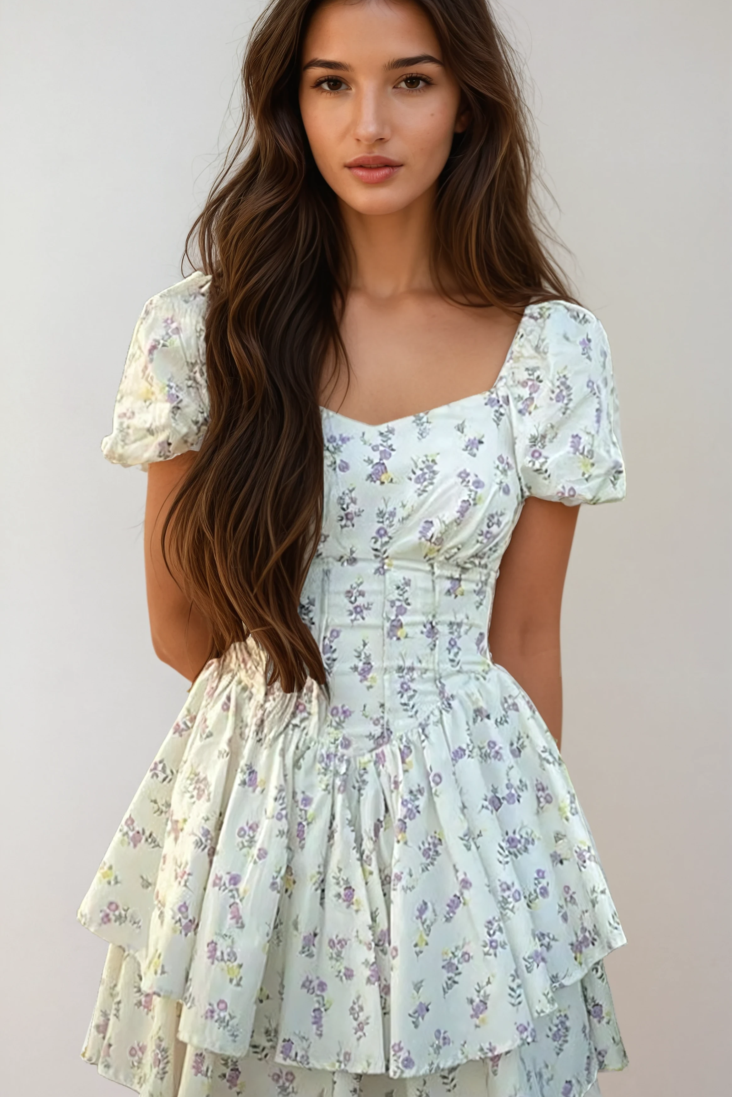 Floral Mini Dress with Puff Sleeves and Removable Belt