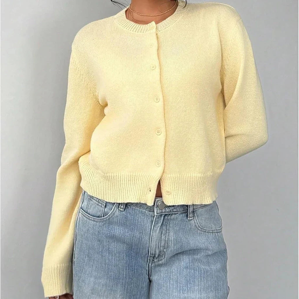 show ▼Designed for comfort with a playful twist. This pastel cardigan brings understated charm with its soft yellow hue and classic silhouette. Featuring a crew neckline, front button closure and ribbed trims, it’s a timeless layering piece that works across all seasons.