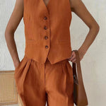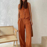 Timeless tailoring meets relaxed summer ease. This two-piece set is crafted from a breathable cotton-linen blend and features a structured buttoned waistcoat paired with wide-leg trousers for an effortlessly put-together look—ideal for warm days when comfort doesn’t mean compromising on style.