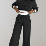 show ▼Effortlessly blending comfort and modern streetwear appeal, this two-piece tracksuit set is your go-to for elevated off-duty style. The cropped hoodie features a drawstring neckline and subtle contrast trim for a sporty edge, while the wide-leg pants provide a relaxed, flowing silhouette that moves with you. Perfect for casual outings, travel days, or relaxed weekends.