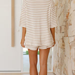 show ▼An effortless set designed for sun-filled days. Featuring a relaxed button-up shirt and drawstring shorts, this beige striped knit co-ord is soft, airy, and endlessly wearable.
