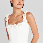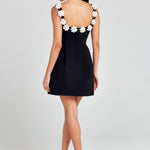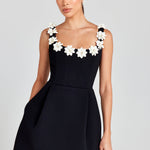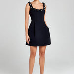 show ▼Playful charm meets refined elegance. This tailored mini dress features a fitted bodice and A-line skirt, adorned with 3D floral appliqués along the neckline and straps for a romantic touch. The structured shape creates a flattering silhouette, while hidden side pockets add a modern, functional detail.