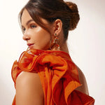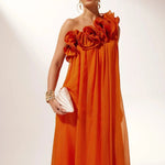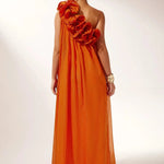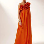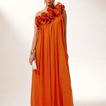 Radiant and effortlessly refined — the Tangerine Bloom Gown is a true statement of bold elegance. Crafted from a fluid chiffon fabric that drapes beautifully, this one-shoulder gown features an exquisite cascade of sculpted ruffles along the neckline, adding volume and drama to its otherwise minimalist silhouette. The luminous orange hue captures the light with every movement, making it a standout choice for galas, weddings, or summer soirées.