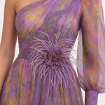 Elegant drama meets artistic expression in this standout evening gown. Crafted from sheer, flowy fabric with a soft iridescent finish, it’s designed to make an unforgettable impression. The one-shoulder silhouette balances a voluminous, balloon-style sleeve with a fitted bodice, while the pleated skirt cascades gracefully to the floor. A bold feathered waistband and thigh-high slit add modern flair to this ethereal look.