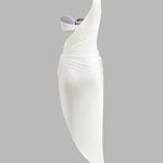 Dramatic elegance meets modern sensuality. This one-shoulder cut-out dress is designed to make a statement, featuring sculpted draping and metallic brooch accents that highlight the waist and bust. Crafted in a silky satin finish, the fluid fabric creates a striking silhouette that flows with every movement. Perfect for glamorous evenings and red-carpet inspired moments.