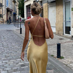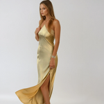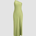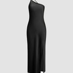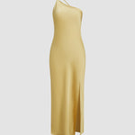 show ▼A sophisticated staple for summer evenings and special escapes. This silky maxi dress features a one-shoulder neckline, soft lustrous finish, and fluid drape with an alluring open back—cut to effortlessly skim the figure with a side slit for added movement and charm.