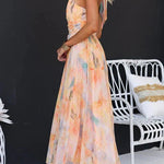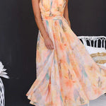 show â–¼Designed for sun-soaked days and elegant evenings, this halter-neck midi dress features a soft watercolor-inspired print in peach and pastel hues. The gathered neckline and cinched waist create a graceful, feminine silhouette, while the flowy skirt adds effortless movement.