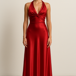 Sleek and luminous, this satin halter gown is a statement in understated glamour. Featuring a twist-front bodice and dramatic open back with bow, it brings elegance from every angle.