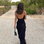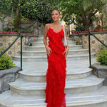 show ▼Romantic and effortlessly striking. This chiffon maxi dress flows with soft ladder ruffle detailing, designed to catch the light with every movement. With its plunging V-neckline, open back, and semi-sheer finish, it’s the perfect choice for summer soirées and elegant garden gatherings.