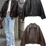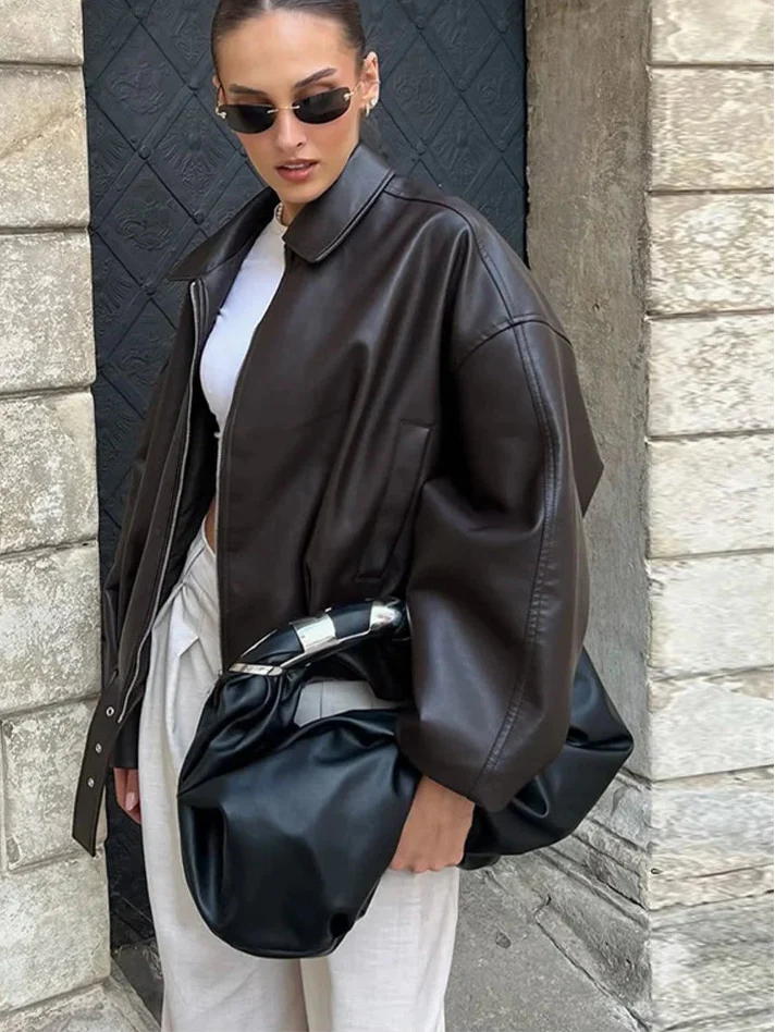 show ▼Designed for comfort with a playful twist. This oversized leather-look jacket blends structure with effortless cool. Featuring a wide collar, relaxed drop shoulders, and an adjustable belt detail, it’s the perfect statement layer for transitional weather—equally stylish over casual denim or a sleek dress.