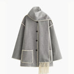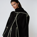 Effortlessly chic with a statement twist. This tailored black jacket pairs classic structure with eye-catching contrast trim and a coordinating scarf for a layered effect that’s both dramatic and polished. The added fringe detailing brings texture and movement to this unique outerwear piece.
