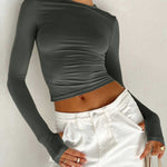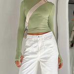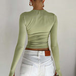 show ▼Designed to move with you. This sleek stretch top features a second-skin fit with ruched detailing that flatters the waist and arms. With its minimalist neckline and subtle thumbholes, it’s the ultimate base layer or statement on its own.