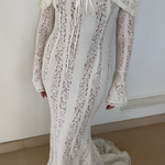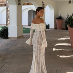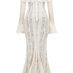 show â–¼Designed for romance with an ethereal touch. This off-shoulder lace gown drapes elegantly over the figure, featuring a fitted bodice, flared sleeves and a floor-sweeping hem. The intricate lace fabric and delicate tie detail at the neckline make it the perfect choice for occasions that call for timeless femininity.