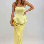 show â–¼The Elliana Maxi Dress blends modern femininity with timeless style, featuring a strapless peplum bodice and sleek ribbed skirt. Double lining ensures comfort and structure, making it perfect for elegant occasions.