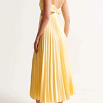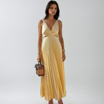 show ▼Lightweight elegance with a modern twist. This pleated maxi dress is designed for graceful movement and summer occasions, featuring a flattering V-neckline, soft cut-out detailing at the waist, and a full pleated skirt that creates fluid drama with every step.