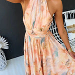 Designed for sun-soaked days and elegant evenings, this halter-neck midi dress features a soft watercolor-inspired print in peach and pastel hues. The gathered neckline and cinched waist create a graceful, feminine silhouette, while the flowy skirt adds effortless movement.
