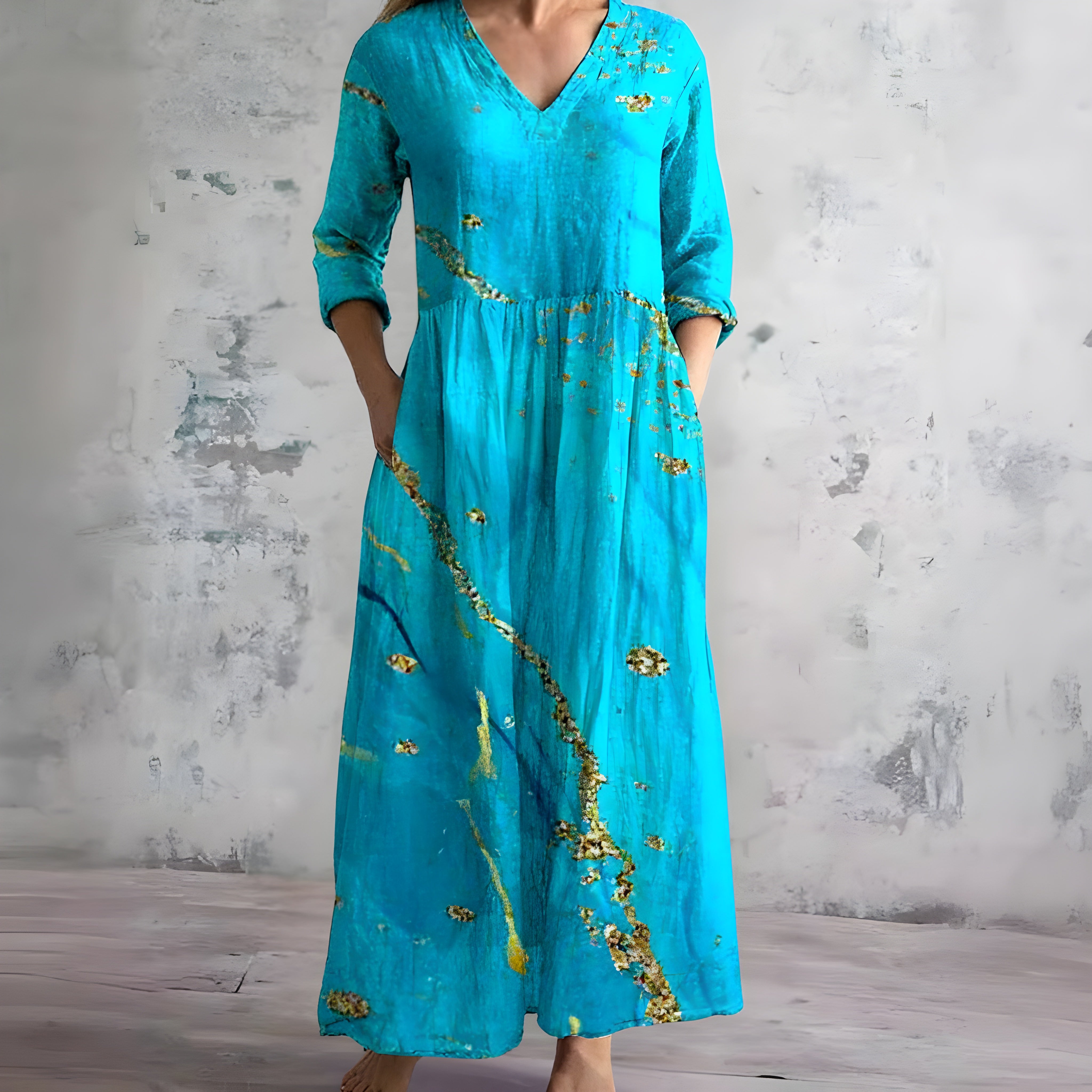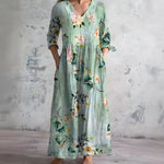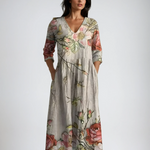 A timeless piece with effortless charm. This flowing summer dress features a vintage-inspired floral print and soft V-neckline for a look that’s equal parts romantic and relaxed—perfect for sunny strolls or unwinding at home.