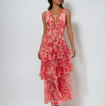 show â–¼The Veda Dress is a layered floral midi designed with lightness and flow in mind. Featuring a deep V neckline and an open strappy back, this piece combines structured femininity with tiered elegance. The sheer overlay creates visual dimension while maintaining breathability, making it ideal for resort evenings, vacation dinners, or event styling in warm climates.