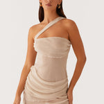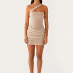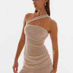 show ▼Designed for modern elegance with a daring twist. This one-shoulder mini dress features an asymmetrical neckline and soft draped layers that flatter the silhouette while adding texture and movement. The sheer finish enhances its feminine allure, making it a standout piece for evenings out or special occasions.