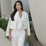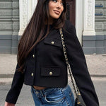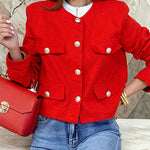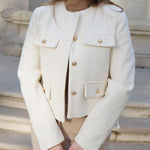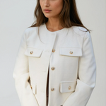 Add instant polish to any outfit with the Grace Pearl Button Cropped Jacket – a refined wardrobe staple with timeless structure and elevated detail. Crafted in a textured woven fabric, this jacket features a boxy cropped silhouette, luxe gold-trimmed pearl buttons and four front flap pockets for a classic touch. Designed for versatility, it layers perfectly over knits, blouses or dresses for that effortless smart look.