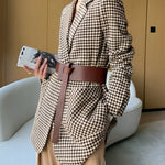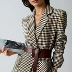A heritage pattern with a bold new silhouette. The Houndstooth Belted Split-Hem Blazer fuses classic tailoring with contemporary attitude—crafted in structured fabric, detailed with sharp lapels, oversized patch pockets, and finished with a statement waist belt to sculpt the silhouette. The side-split hem adds unexpected movement to this standout layer.