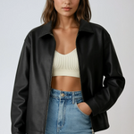 Effortlessly cool and endlessly versatile, this faux leather jacket is the ultimate layering piece for any season. Crafted from supple vegan leather with a smooth, structured fit, it brings a modern edge to your everyday wardrobe. The relaxed silhouette, zip-front closure, and classic spread collar make it a go-to staple for adding a touch of attitude to any outfit.