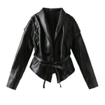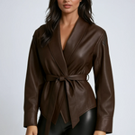 Sharp meets sleek in this sculpted faux leather wrap jacket. Featuring a tailored silhouette with lace-up shoulder detailing and a waist-defining belt, it blends structured polish with edgy appeal. Whether styled with leather pants or denim, this piece adds instant drama to your outfit.