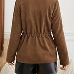 Designed for casual versatility. This brown corduroy jacket is detailed with four buttoned flap pockets and a shirt-style collar for a utility-inspired look. The adjustable drawstring waist allows you to define your shape, while the button-down front and long sleeves make it an easy layering piece. A timeless wardrobe essential that combines function and style.