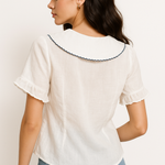 A fresh twist on a timeless classic. This lightweight button-up blouse features a scalloped collar and subtle ruffle sleeves for a soft, feminine feel.