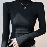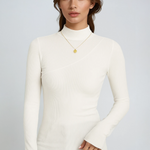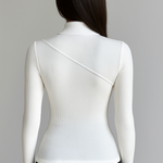 Designed for comfort with a playful twist. This fitted ribbed top features a mock neckline and subtle diagonal seam detailing for a clean and sculpted silhouette—perfect for layering or wearing on its own.