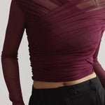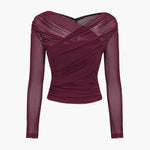 Romantic and modern, this sheer mesh top brings a touch of elegance with a daring edge. Crafted with delicate ruching across the body and semi-transparent sleeves, it creates a flattering silhouette that feels both bold and refined. The deep hue adds sophistication, making it the perfect statement piece for evening dressing.