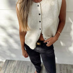 show ▼Designed for ease with a modern twist. This button-up sweater vest features a clean sleeveless cut and chunky ribbed edges, making it an ideal layering piece or stand-alone statement—perfect for transitioning between seasons.