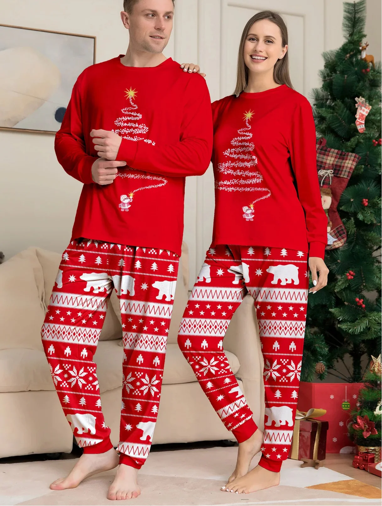 Create unforgettable holiday memories with our Family Matching Christmas Pyjamas Designed in festive red with a sparkling Christmas tree print on the tops and playful polar bear patterned pants, these cozy PJs bring everyone together in style.
