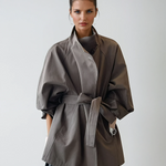 show â–¼Designed for comfort with a playful twist. This belted trench-style jacket offers timeless elegance with a modern relaxed fit. Featuring a high collar, wrap-front button detail and a detachable waist tie, it creates a flattering silhouette while remaining effortlessly versatile. Available in classic beige and deep chocolate brown.