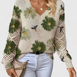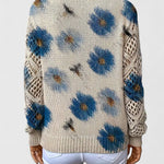 This finely knitted sweater with purple and lavender flowers adds a subtle, feminine touch to any outfit. The airy sleeve insert provides coverage for your arms without sacrificing comfort, and the gentle V-neck makes it perfect for pairing with a necklace or scarf.