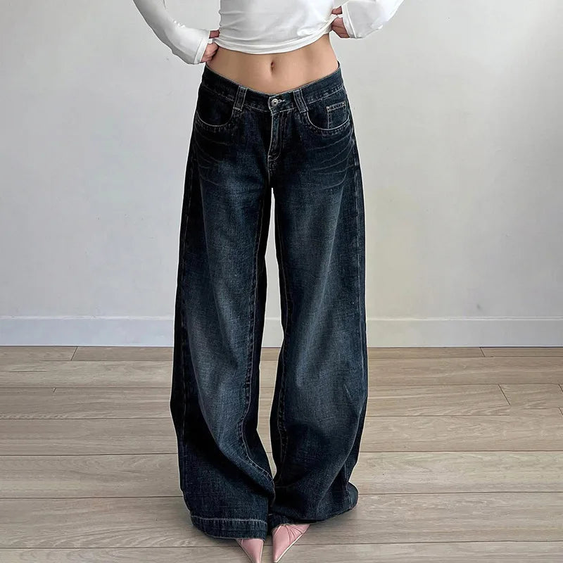 show ▼A modern nod to retro streetwear. These wide-leg denim jeans feature a low-rise waist and loose silhouette, bringing effortless edge to casual dressing. Designed with a relaxed fit and washed finish, they’re a versatile staple for off-duty style.