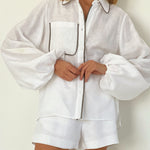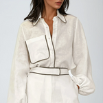 Breezy and refined with a minimalist edge. This cotton-linen set blends soft tailoring with thoughtful contrast piping, perfect for sunlit mornings or city strolls. Lightweight yet structured, it offers timeless summer polish in the easiest form.