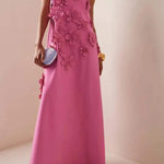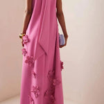 Minimalist elegance meets statement detailing in this maxi dress adorned with cascading 3D floral appliqués. Designed to flow effortlessly, it combines a structured neckline with a relaxed silhouette for a look that is both graceful and modern.