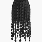 Bold design meets sculptural texture. This laser cut midi skirt features layered circular cutouts arranged in a double-layered jacquard knit, creating a visually dynamic and architectural silhouette. The high waist and clean finish offer balance to the playful, tactile design.