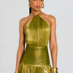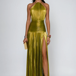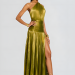 Make a lasting impression with this metallic halter maxi dress in a rich peridot hue. Featuring a fluid pleated fabric that reflects the light with every step, it’s designed for evenings that demand glamour and confidence. The sculpted waistband creates a flattering silhouette, while the high slit and open back add just the right amount of drama.