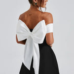 A romantic take on a classic silhouette. This structured mini dress features a contrast Bardot neckline, sculpted bubble skirt, and a soft bow detail at the back—designed to flatter and turn heads from every angle.