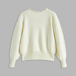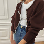 Polished yet playful, this cardigan brings a refined edge to your everyday layering. Designed with a classic round neckline and detailed with elegant pearl trim, it adds a subtle statement to both casual and elevated looks. The soft knit construction and lightly frayed edges balance timeless charm with relaxed sophistication—perfect for dressing up denim or finishing off a tailored ensemble.