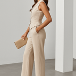 Understated elegance meets modern tailoring in this sleeveless suit set. Featuring a sculpted vest with a cinched waist and straight-leg trousers, this ensemble blends structure with soft sophistication. The neutral hue makes it a versatile choice for both business and occasion wear.
