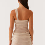 Designed for modern elegance with a daring twist. This one-shoulder mini dress features an asymmetrical neckline and soft draped layers that flatter the silhouette while adding texture and movement. The sheer finish enhances its feminine allure, making it a standout piece for evenings out or special occasions.