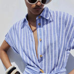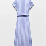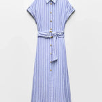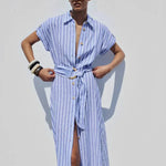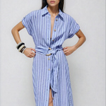 Effortlessly chic with a breezy touch. This striped shirt dress is designed for both comfort and style, featuring a button-down front, short sleeves and a tie belt that defines the waist. The airy fabric and relaxed fit make it an ideal piece for warm days and easy layering.