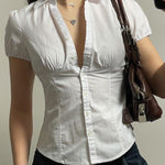 show ▼Designed to flatter with its tailored silhouette and soft structure, this slim-fit poplin shirt adds a polished yet playful feel to your everyday wardrobe. Featuring a deep V-neckline, puffed sleeves and delicate ruching at the bust, it brings a modern femininity to classic shirting—perfect for everything from coffee catch-ups to evening dinners.