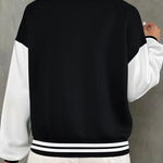 show ▼Designed for sporty chic. This varsity jacket features a black body with contrasting white sleeves, finished with striped ribbed trim at the collar, cuffs, and hem. A bold letter “A” patch on the chest adds a collegiate-inspired detail, while the snap-button front closure ensures easy wear. Perfect for layering, this jacket blends casual comfort with statement style.